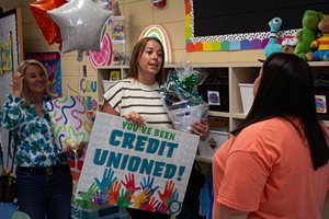 Erika was delighted when she received a surprise visit in her first-grade classroom at Fultondale Elementary from Kathryn Johnson, the Gardendale Branch Manager of ēCO Credit Union. Kathryn brought balloons, a gift basket,